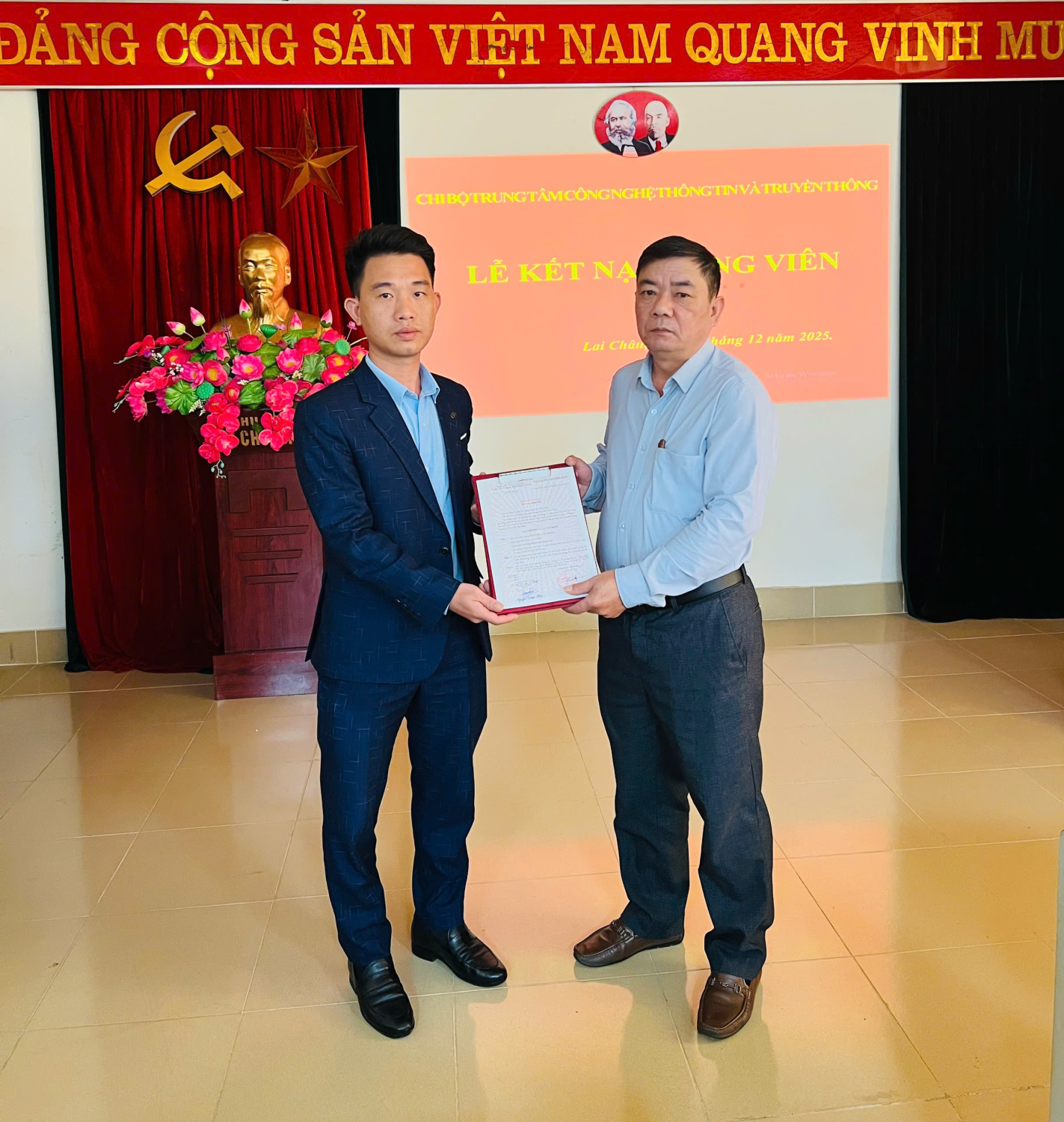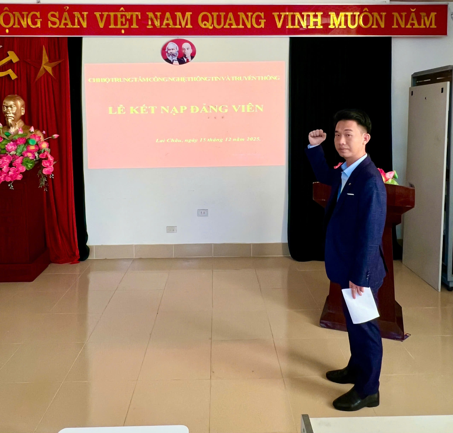 Chiều ngày 15/12/2025, vào hồi 15 giờ, Chi bộ Trung tâm Công nghệ thông tin và Truyền thông tỉnh Lai Châu long trọng tổ chức Lễ kết nạp Đảng viên Đảng Cộng sản Việt Nam cho quần chúng ưu tú Nguyễn Văn Chiến. Buổi lễ diễn ra trang nghiêm, đúng trình tự, thủ tục theo Điều lệ Đảng.